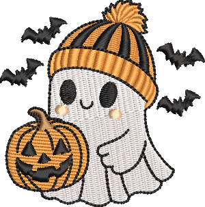 Muestra a un pequeño fantasma bebé con un gorro naranja y una calabacita entre sus manos, acompañado de murciélagos decorativos que dan vida y movimiento al diseño. Su estilo suave, expresivo y encantador lo convierte en una opción perfecta para prendas infantiles o temáticas de temporada.
